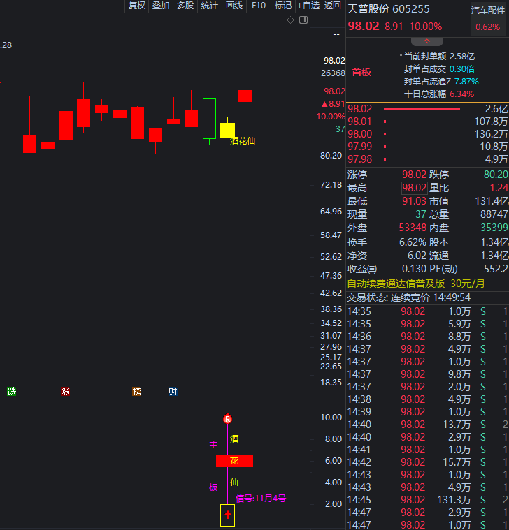 11月4号《酒花仙》天普股份  隔天涨停10%