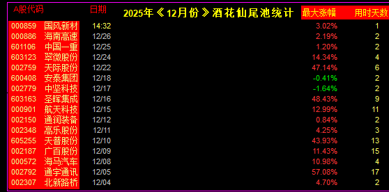 12月份整月统计《酒花仙》:主板尾1支擒牛 实时追踪