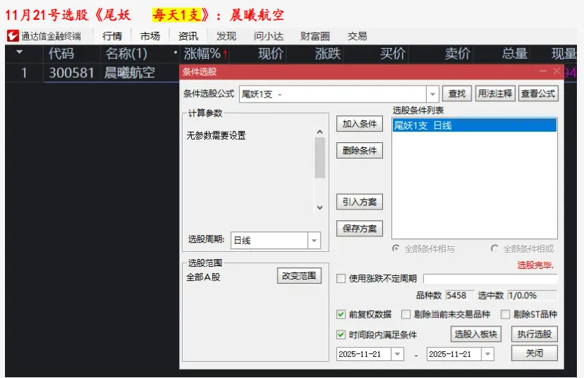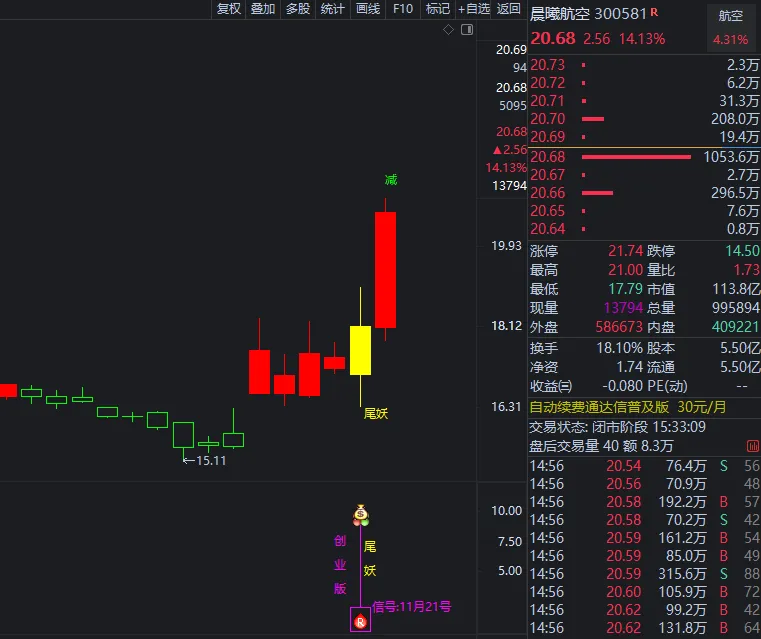 11月21号选股《尾妖   每天1支》:晨曦航空  隔天拉14%
