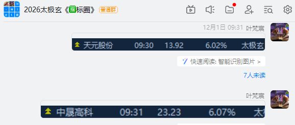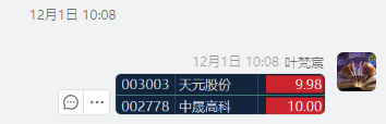 12月1号《太极玄》天元股份 板10%    中晟高科 板10%