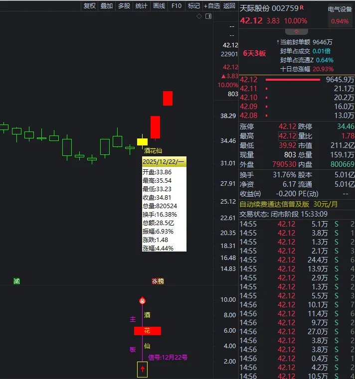 12月22号《酒花仙》天际股份  持续涨停2天20%