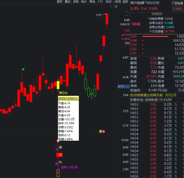 12月22号/16号/2号《酒花仙》主板尾擒牛:天际股份20% 圣晖集成30% 合兴包装30%