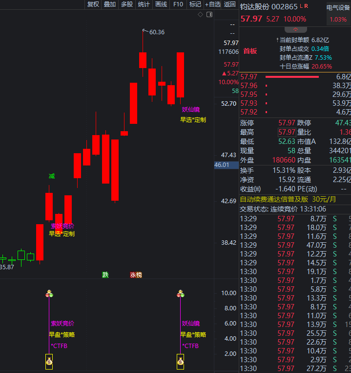 1月6号《妖仙镜》主板早盘擒牛: 钧达股份 实时预警2.88% 收盘拉板